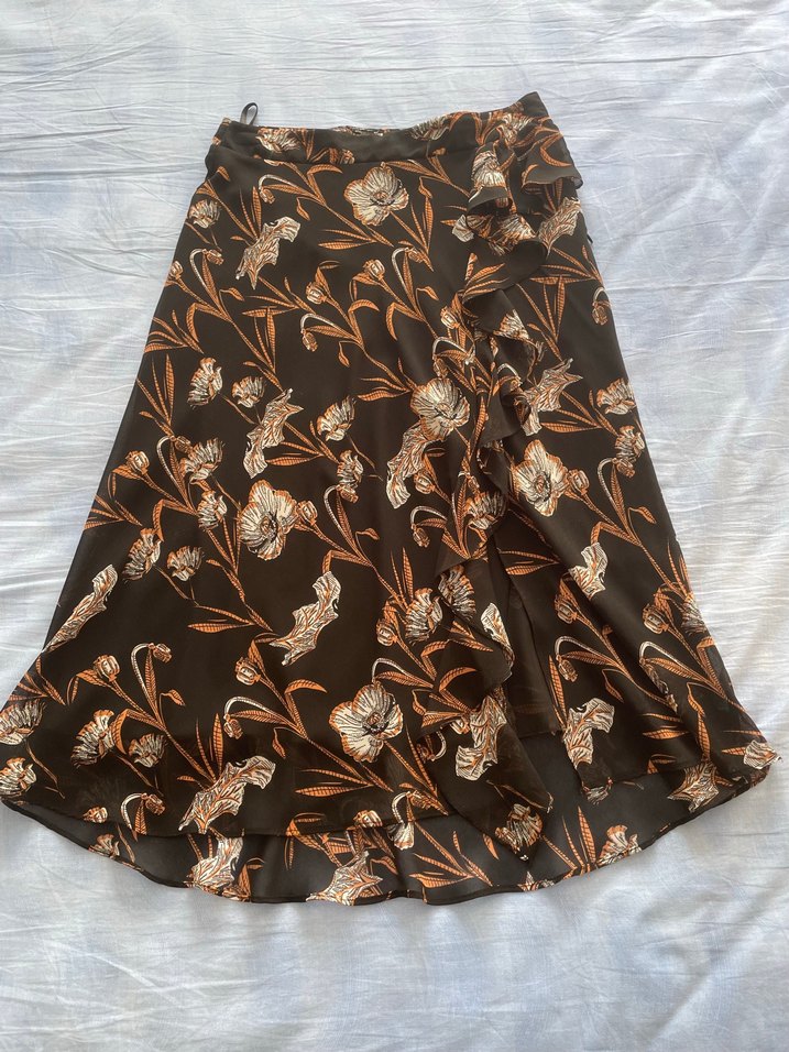 İpekyol Kahverengi çiçek desenli, uzun ve bol kesim midi etek. İpek gibi dokusuyla bohem ve retro tarzı yansıtıyor. Beden:40 Boy:76cm Bel:76cm