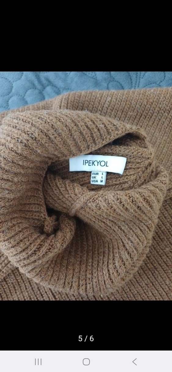 IPEKYOL markalı, kahverengi yün balıkçı yaka, kısa kesim, uzun kollu, ince dokuma kazak. Sokak stiline uygun rahat bir parça.