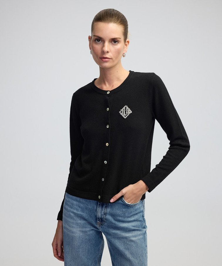 Sezon gardırobunun rafine dokularını bir araya getiren triko hırka, geniş kullanım alanı sunuyor. Ön panelindeki kristal taş işlemeleri ile göz alıcı bir zarafeti vurgulayan hırka, özellikle kusursuz bitişlere odaklanan çok yönlü bir tasarım.
