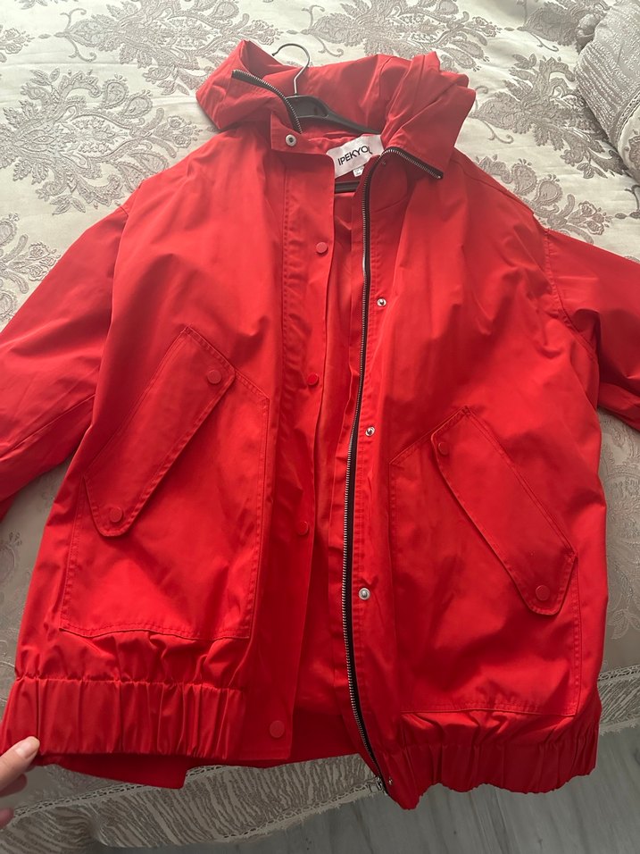 Tertemiz ,mağazadan yeni alınmış gibidir . Uzun kollu, düğmeli ve parlak kırmızı renkte, bol kesim midi ceket.sokak stiline uygun dış giyim.