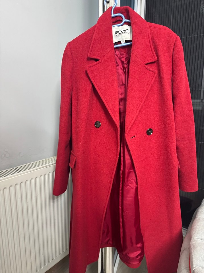 İpekyol marka, canlı kırmızı renkte, çift düğmeli uzun kaban. Klasik yaka ve yan cepler bulunur, içi ise parlak astarlıdır.