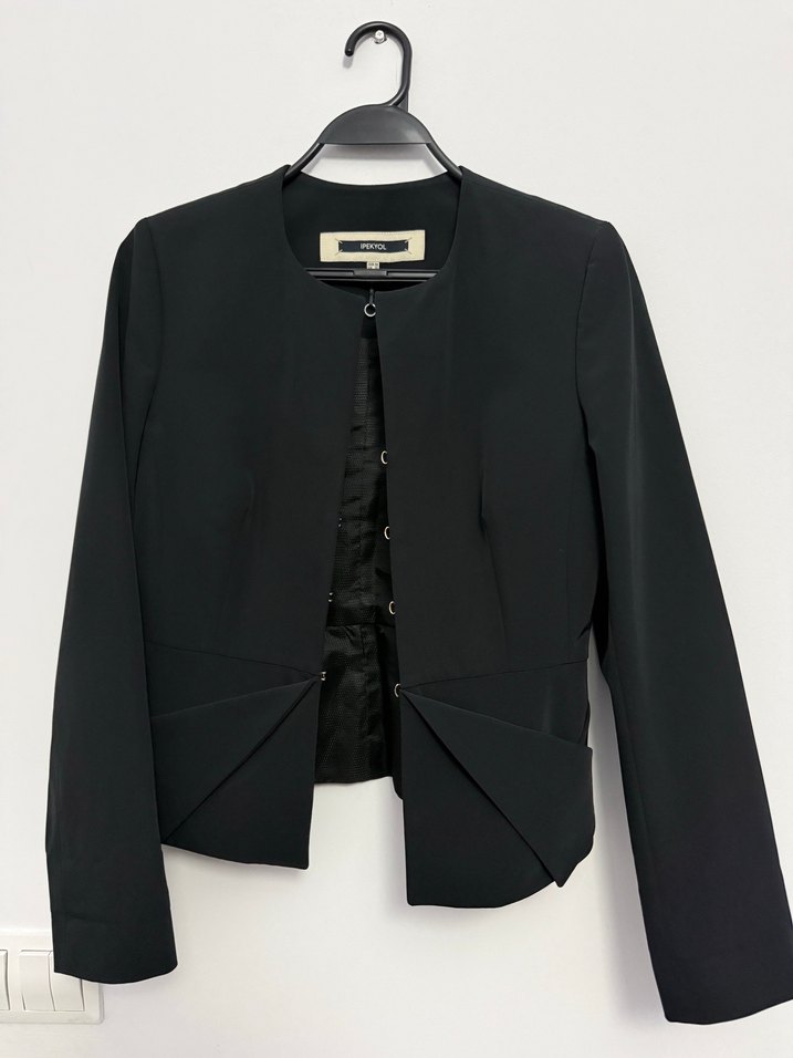 İpekyol 38 beden uzun kollu siyah kadın blazer ceket. Normal kesim ve midi boyda, düz ve desen içermeyen sentetik kumaştan üretilmiştir. Ofis için uygundur.