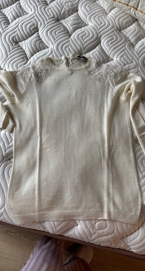 Uzun kollu, yuvarlak yakalı beyaz örgü kadın kazak. Omuzlarda ince örgü detayları bulunur. Rahat ve konforlu, günlük kullanım için uygundur. Boyu 56 cm eni 40 cm kolunda ufak bi kaçığı var belli belirsiz görselde mevcut