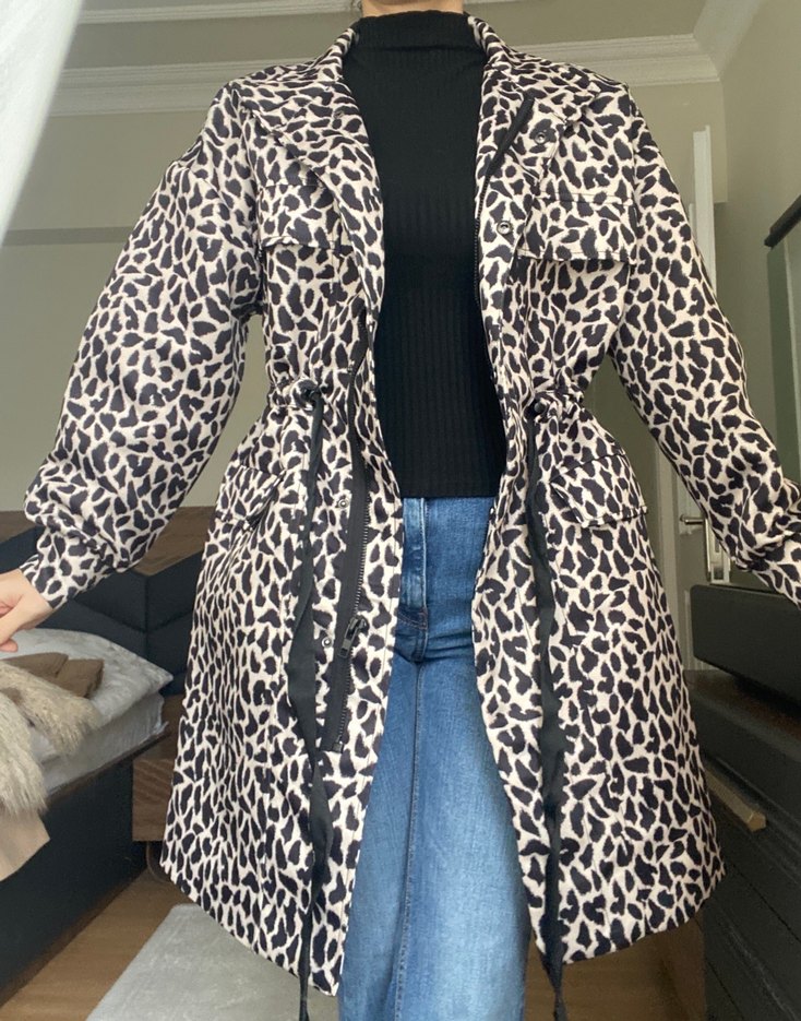 Kadın midi boy leopar desenli kaban, bol kesim, yaka detaylı ve kürk süslemelidir. Sentetik kumaştan üretilmiş, uzun kollu ve günlük sokak stili için uygundur.