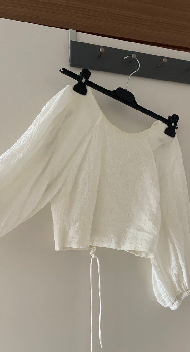 Beyaz keten bluz, tekne yakalı ve uzun, drapeli kollarıyla rahat bir kesime sahiptir. Kırop ve minimalist bohem tarzıyla günlük kullanıma uygundur.