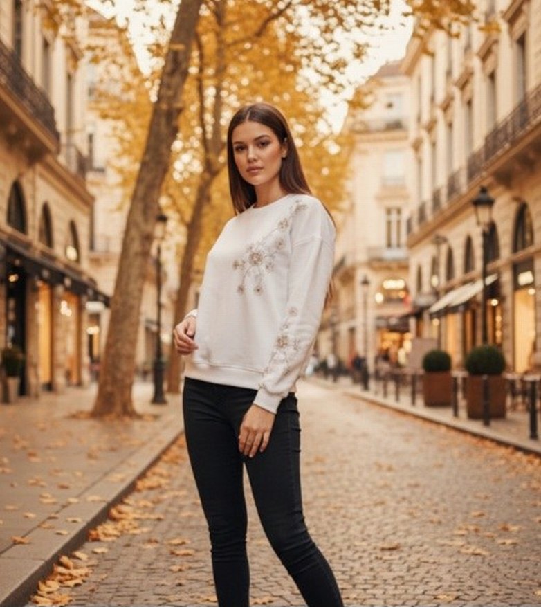 boncuk işlemeli detaylı uzun kollu, bol kesim sweatshirt. Triko kumaştan, bisiklet yaka ve normal boyda, günlük sokak stiline uygun. ölçü sorabilirsiniz