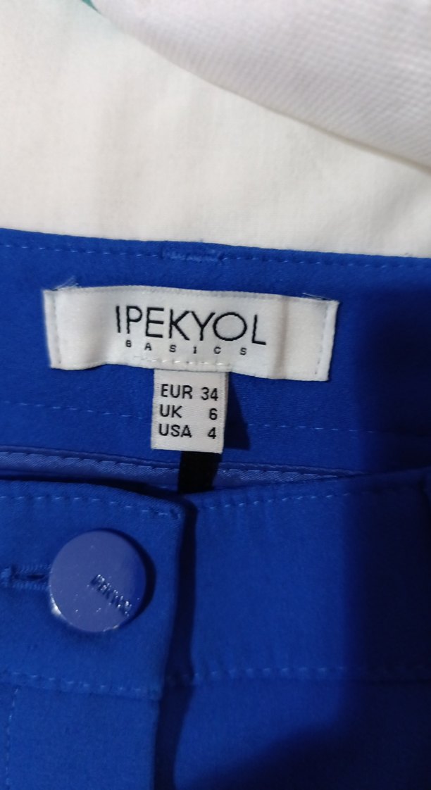 IPEKYOL Basics marka koyu mavi erkek rozeti, EUR 34, UK 6, USA 4 beden etiketlidir. Sokak modasına uygun.