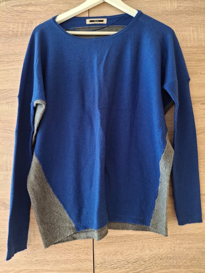 Uzun kollu, yuvarlak yakalı, mavi ve gri renklerde örme yün kadın kazak. Rahat ve bol kesim, günlük kullanıma uygun.