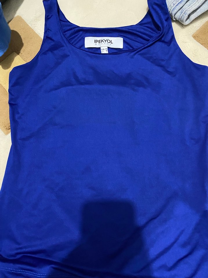 IPEKYOL markalı, parlak mavi, kolsuz ve vücuda oturan atlet. Spor ve sokak tarzına uygun, yuvarlak yakalı ve sentetik kumaştan yapılmıştır. ♀️