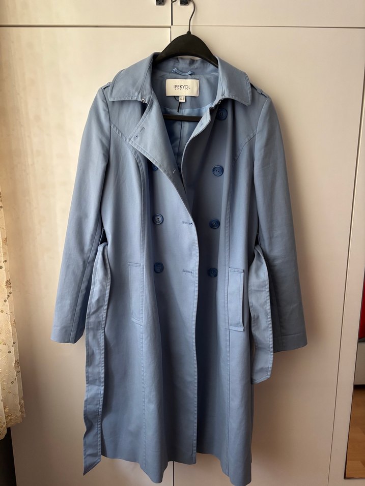 Mavi midi trençkot, düğmeli ön detaylıdır. Uzun kollu, normal kesim ve ofis ya da günlük sokak stili için uygundur. Çok hafif kumaşta sararma mevcut yaka kısmında ve kuşağında ama belli belirsizdir