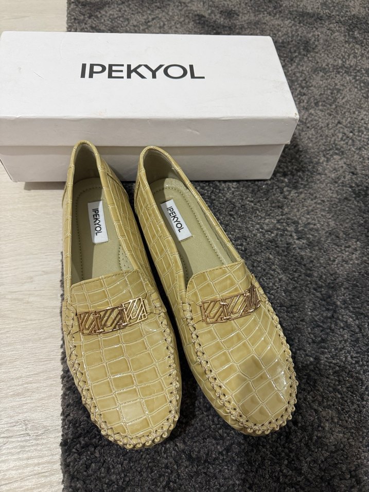 Bej deri, yılan desenli ve kemerli kadın loafer. Blok topuklu, günlük kullanıma uygun şık bir model.40 numara etiketli hiç giyilmedi