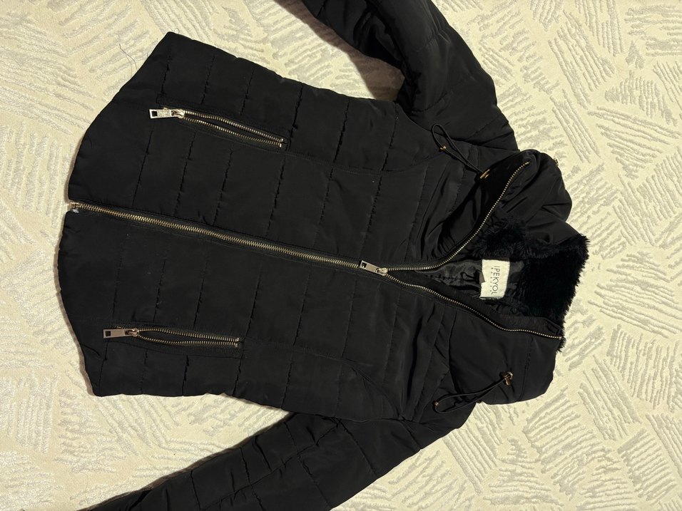 Fermuarlı, yakalı ve askılı kollu siyah kadın kışlık mont. Rahat fleece kumaştan, midi boy ve fitted kesim, günlük sokak stili için uygun. ❄️