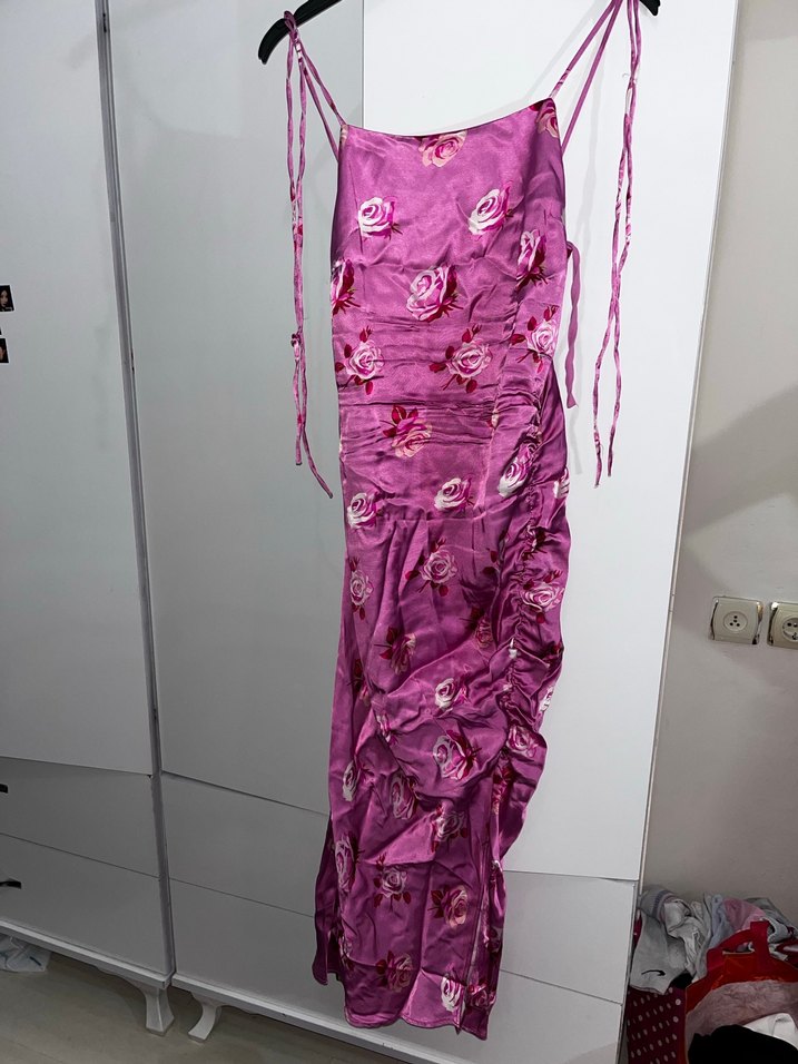 İpekyol marka Drapeli detaylara sahip, straplez ve uzun mor tonlarında desenli elbise. Yumuşak sentetik kumaştan, romantik akşamlar için bohem tarzda. Hiçbir defosu yoktur 36-38 bedendir