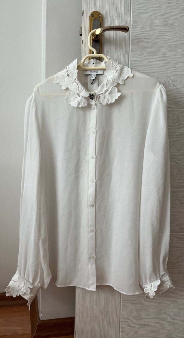 Nakışlı detaylı yakaya sahip , önü düğmeli beyaz gömlek. İnce ve dökümlü kumaşı ile rahat bir kullanım sağlar. Uzun kollu , bol kesimdir . Beden:38 Kusursuz ve temizdir.