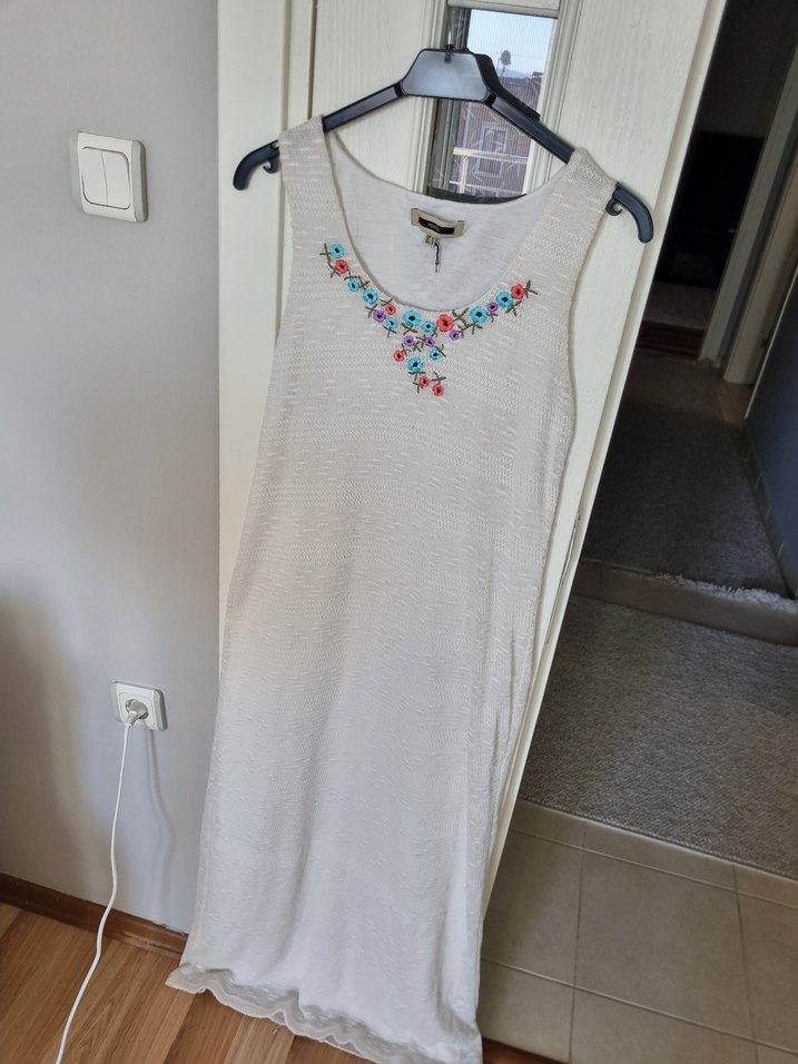 Nakışlı ve boncuk detaylı beyaz, kolsuz uzun elbise. V yaka ve bol kesimlidir. Yumuşak dokulu kumaştan, günlük kullanıma uygundur. Tatilde plajda çok rahat ve güzel oluyor