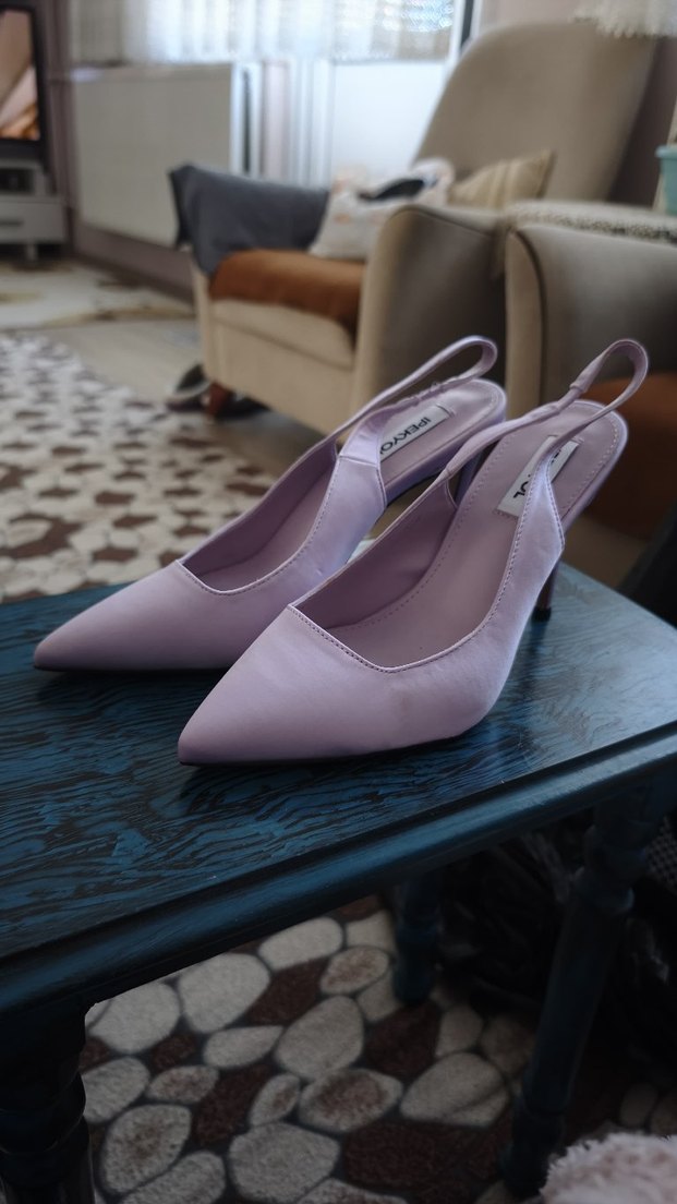 Pastel mor renkte, sentetik kumaştan yapılmış, tokalı ve stiletto topuklu kadın abiye ayakkabısı. Minimalist ve normcore tarzında, düğün için uygun. sol ayallabinin kosesinde hafif bi leke var ancak cok belli olmuyor