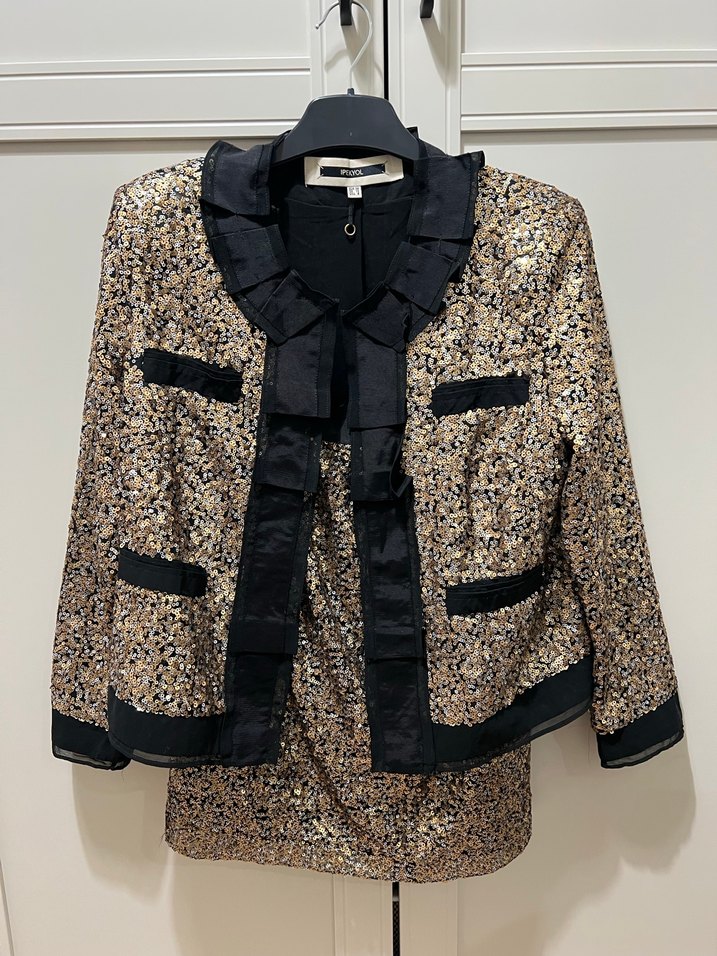 Bedeni 38/M, sayılı giyilmiştir,hiçbir sorunu yok. Üstte oldukça şık duran bir model . Ceket vatkalıdır ,her ikisinin de iç astarı mevcut.Etek belden 35cm lastiklidir,boydan 50cm.