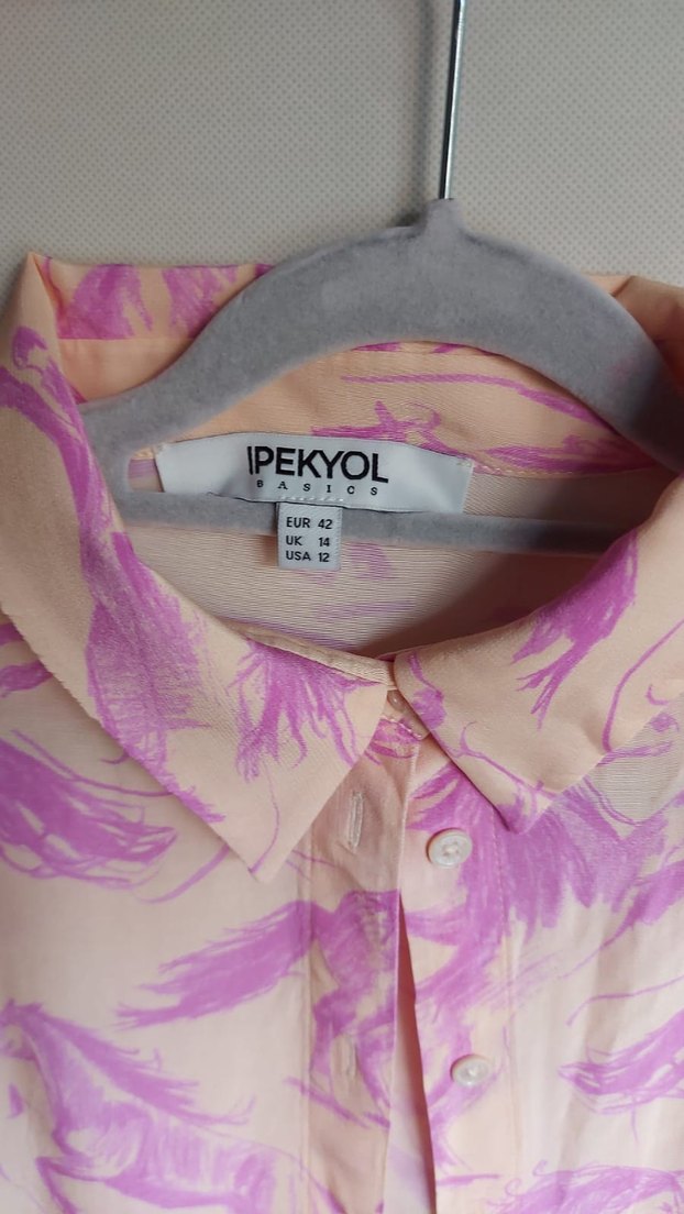 IPEKYOL markalı, pastel pembe desenli, yakalı ve düğmeli kadın gömleği. İpek gibi yumuşak kumaştan, kısa kollu ve bol kesimdir.