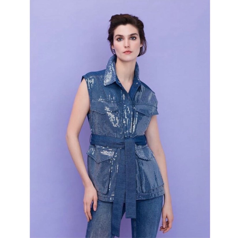 Parlak bağlamalı bel detaylı, kolsuz lacivert kot ceket. Kısa ve mini kesim, bağcıklı ve regular fit. Sokak stili için ideal.tertemix 1-2 kez giyildi