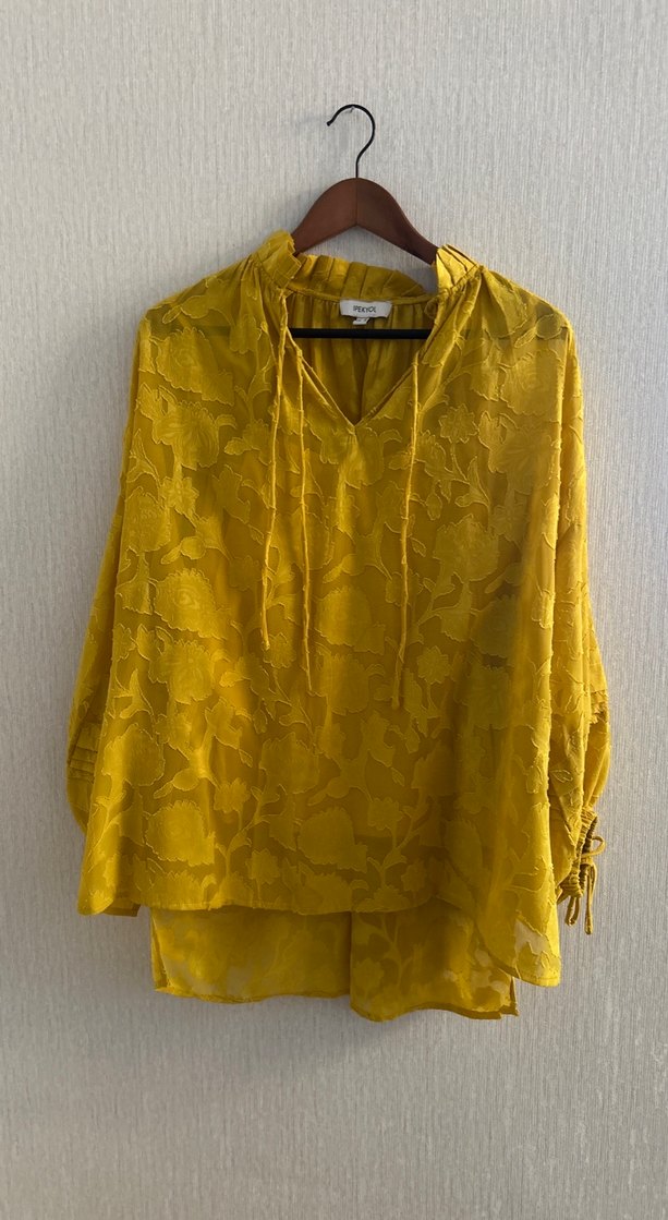 Sarı, uzun kollu, dantel detaylı ve V yaka bol kesim kadın bluz. Yumuşak keten kumaştan, parlak batik desenli, bohem tarzı için uygun.