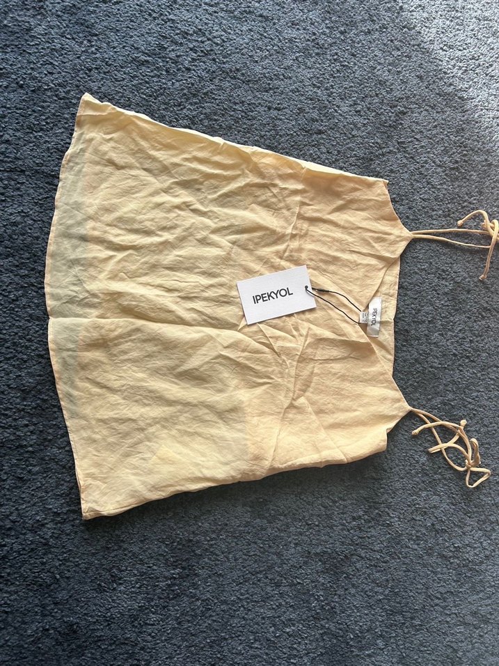 İpekyol sarı keten mini atlet, halter yaka ve volan detayına sahiptir. Gevşek kesimi ve pastel tonu günlük kullanıma uygundur. Göğüs astarı mevcut