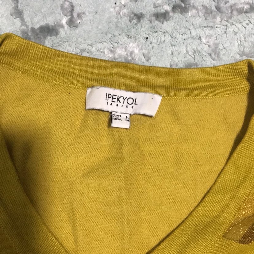 IPEKYOL markalı, uzun kollu ve tekne yakalı sarı renkli, yün triko kadın kazak. Baskılı desenli ve dar kesim, trend sokak stili için uygundur.