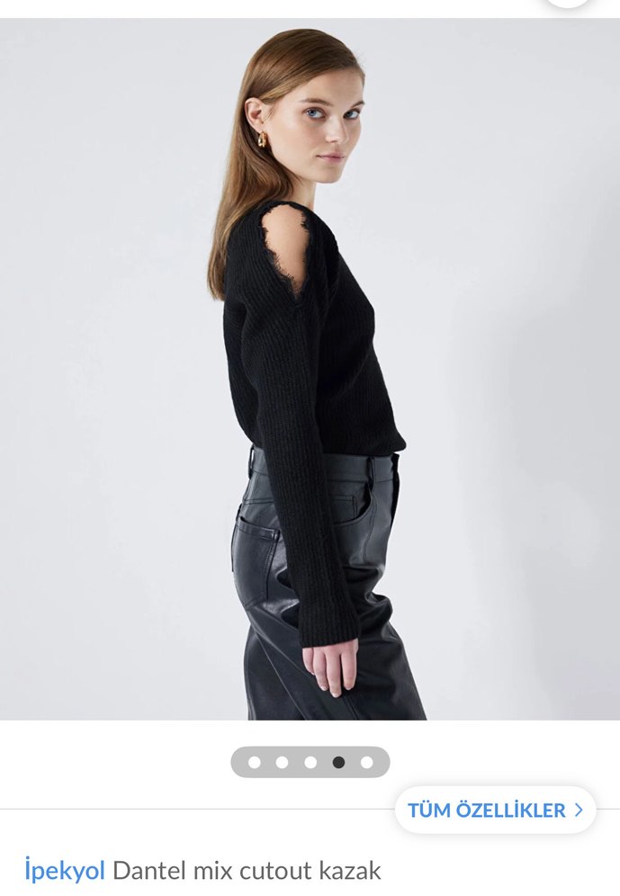 Siyah, v yaka ve uzun kollu, dantel kesim detaylı, deri görünümlü kumaştan yapılmış şık ve minimal kesim kazak. // İpekyol S beden ama M gibi düşünü siyah V yaka omuz dekolteli kazak
