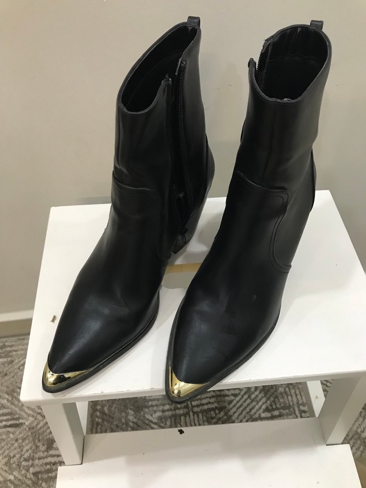 Siyah deri kadın bot, ince stiletto topuklu, parlak ve şık altın renkli burun detaylı, günlük kullanıma uygun modern tasarım. 39 numara ipekyol markalı