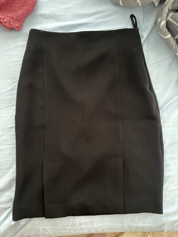 Düz siyah renkte, oturan kesimli, pilili midi uzunlukta kalem etek. Sentetik kumaştan, iş ortamına uygun.