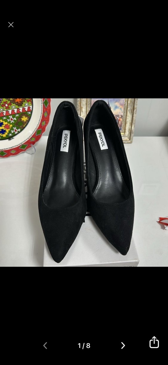 İpekyol marka siyah süet stiletto topuklu ayakkabı, baskılı deseniyle ofis için cesur ve minimal tarzda şık bir seçim.