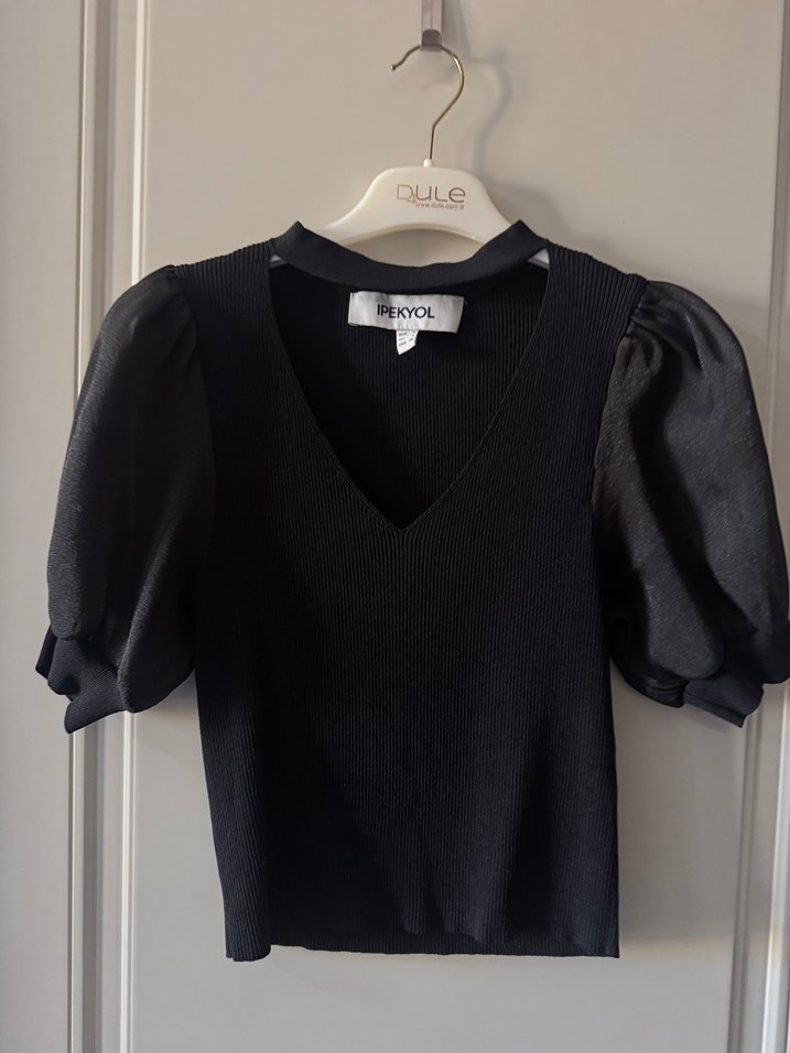 IPEKYOL markalı, V yakalı, kısa balon kollu, triko dokulu siyah dar kesim bluz, ofis ve günlük sokak stili için uygun. Kumaşı çok esnek her bedene uygun resmen
