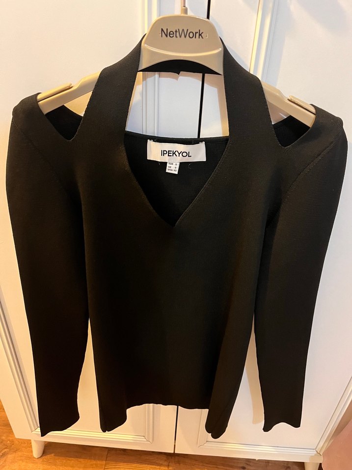 IPEKYOL marka siyah, V yaka, uzun kollu, ince örgü yün kazak. Ofis ve sokak modasına uygun, vücuda oturan kesime sahip.