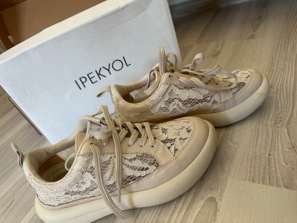 İpekyol markalı, bej renkte dantel nakışlı ve dolgu topuklu spor ayakkabılar, rahat athleisure tarzı için uygundur.