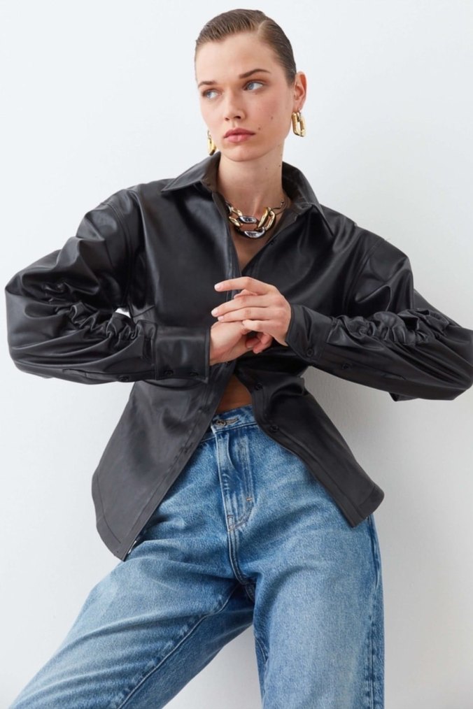 IPEKYOL BÜZGÜLÜ KOL SİYAH Suni Deri GÖMLEK. Çok şıktır.