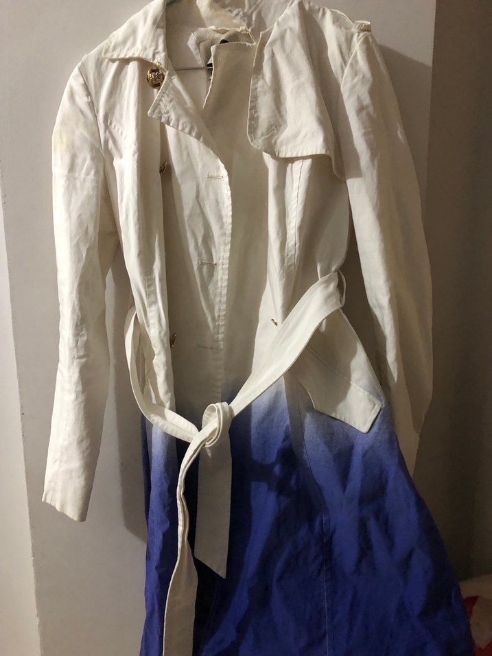Midi boy, keten kumaştan, beyaz-mavi batik desenli, yaka detaylı ve kuşaklı bol kesim trençkot. Uzun kollu, bohem tarzda