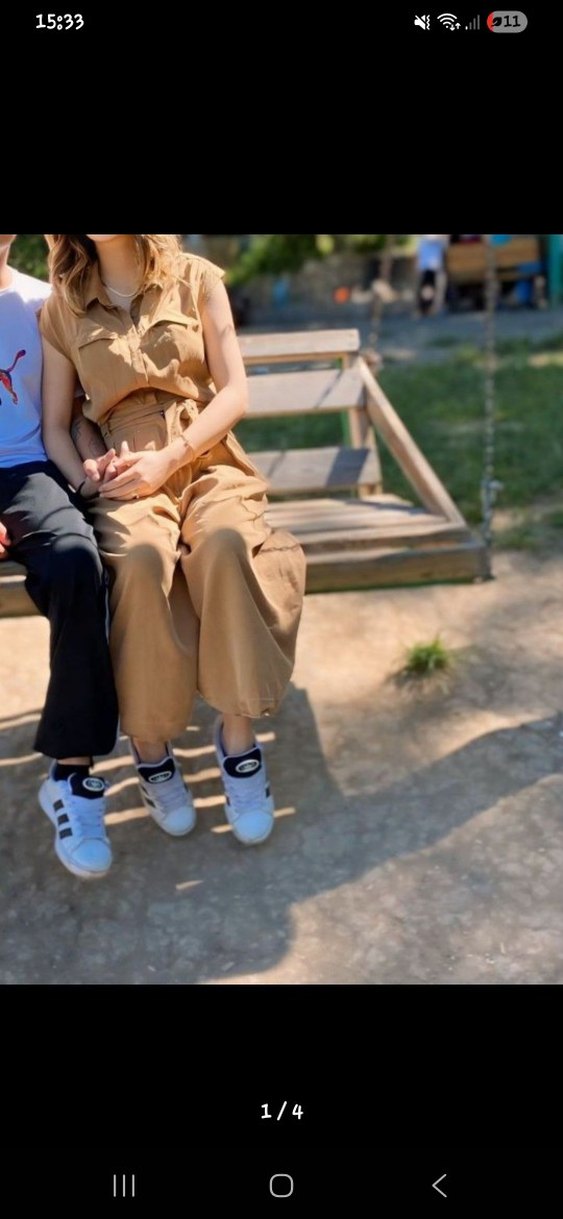 ipekyol taba rengi bol paça tulum çok az kusurları var ama üzerine giyince belli olmuyor zaten pileli gibi duruyor ayrıca kemerin hemen altına geliyor fotoğrafta belli olmadığını görebilirsiniz
