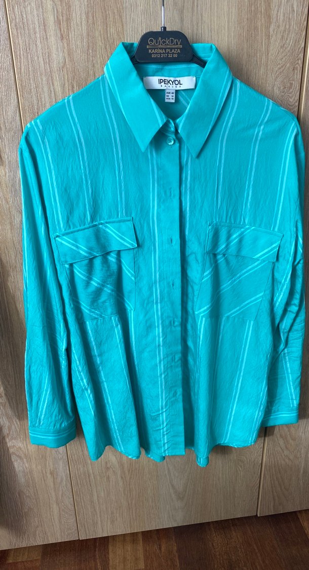 Turkuaz, parlak batik desenli, düğmeli, uzun kollu, yakalı, bol kesim IPEKYOL gömlek. Rahat sentetik kumaştan, günlük sokak tarzına uygun. Kolaltı. 59 cm Boy 73 cm