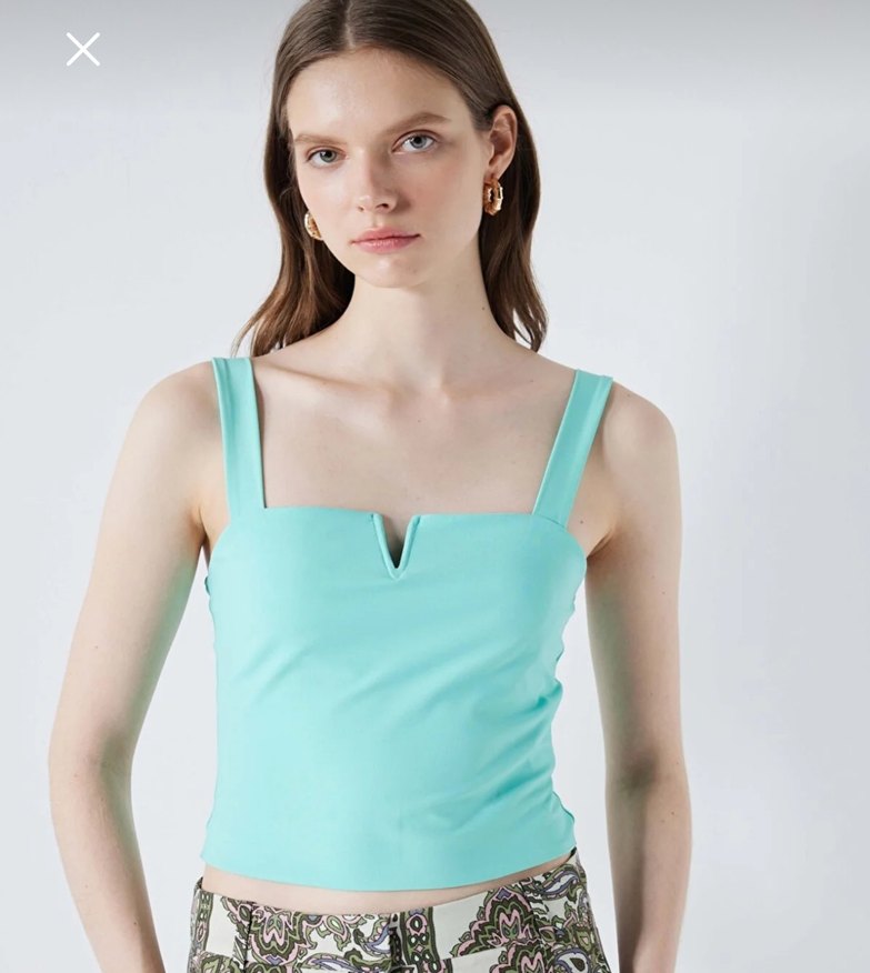 Turkuaz renkte, V-yaka ve kolsuz, kısa kesim ve vücuda oturan mini büstiyer. Pürüzsüz sentetik kumaştan yapılmıştır, gündelik kullanıma uygundur.