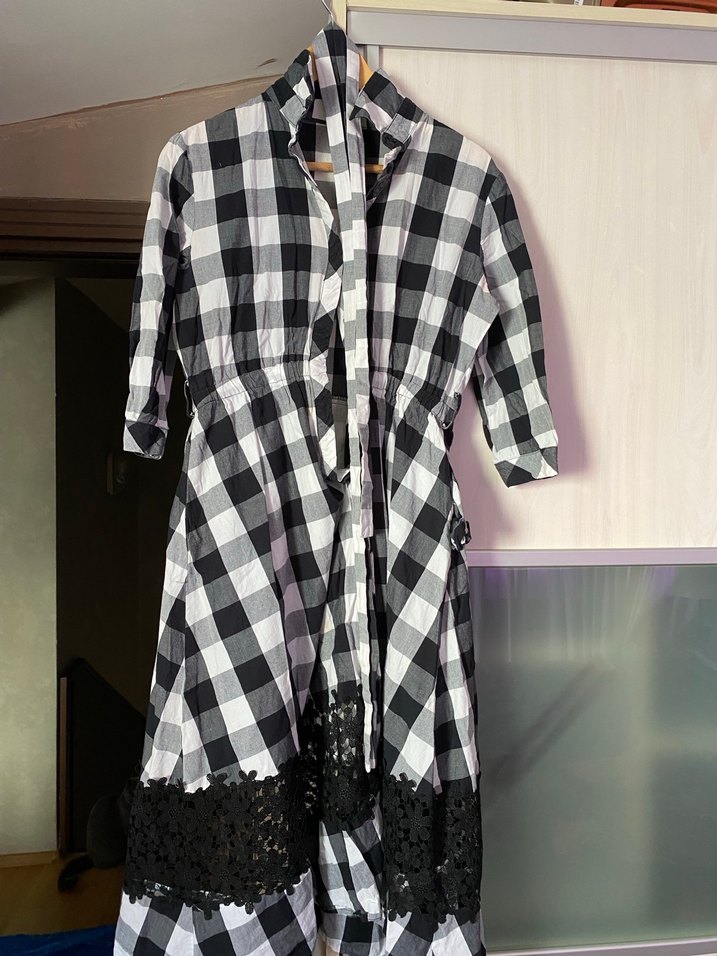 Pamuk kumaştan yapılmış, düğmeli, yakalı ve uzun kollu, gri ekose desenli, bol kesim uzun elbisedir. Alt kısmında siyah dantel detayları bulunur. orjinal üründür