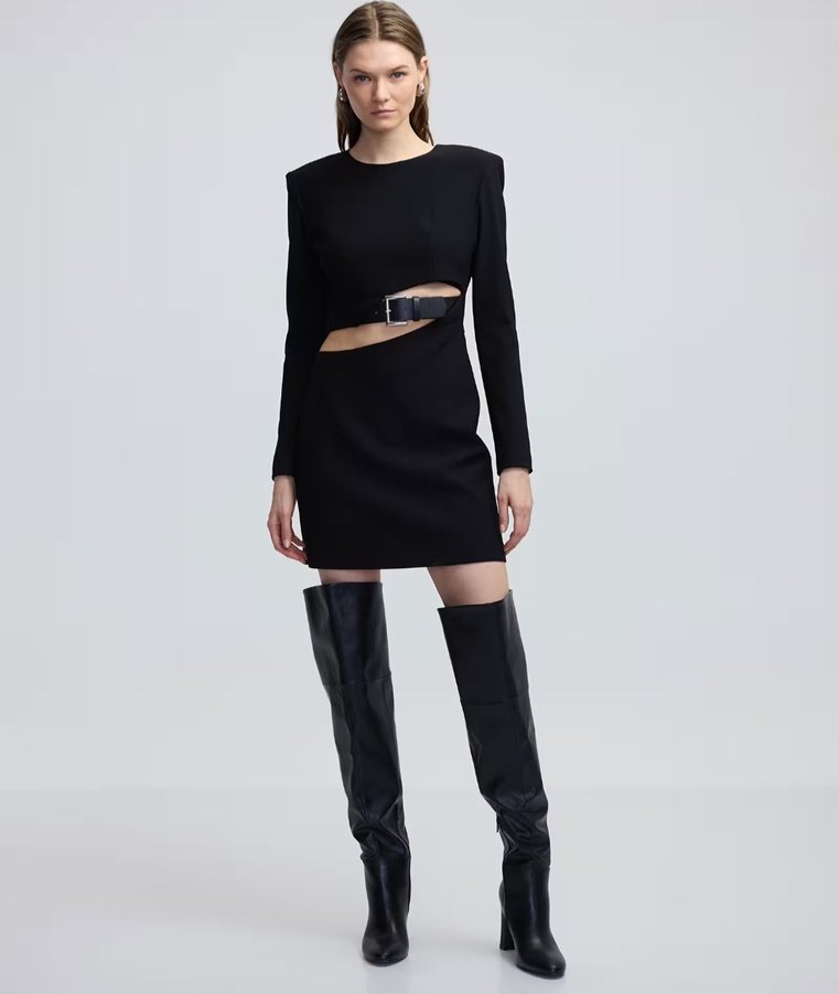 Ipekyol Uzun Kollu Kemerli Siyah Mini Elbise