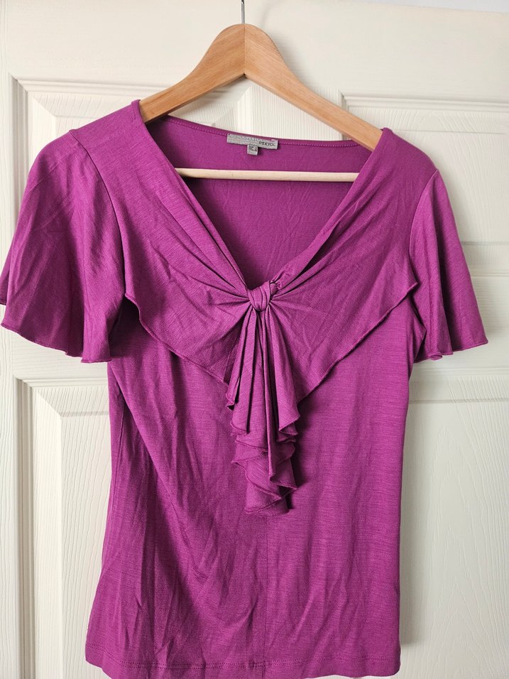 Mor renkli, V yakalı, drapeli detaylı kadın bluz. Kısa kollu ve bol kesimli, ipeksi ve parlak kumaştan yapılmıştır. Ofis için uygundur. Hiç giymediğim için satışta. Herhangi bir sorunu yoktur.