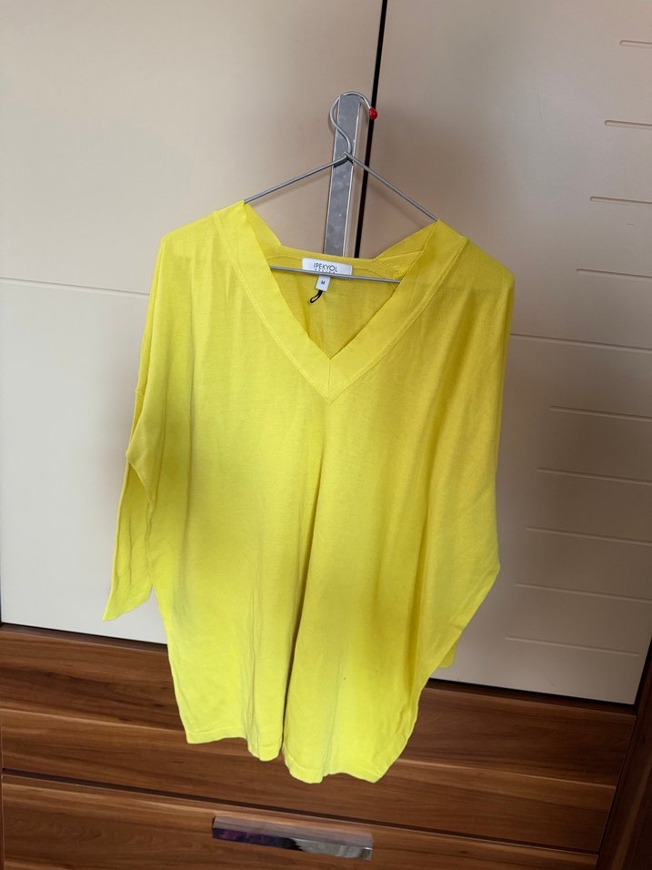 Sarı renkli, V yaka ve uzun kollu ince kazak. Kapri kol. M/L uyumlu.