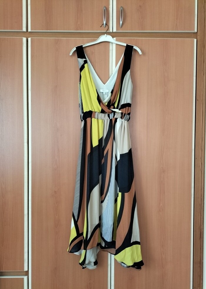 İpekyol marka 34 beden ama 36-38 bedene kadar olur. Üstü kalın şifon kumaş, içi beyaz astarlı. Hiçbir kusuru yok.