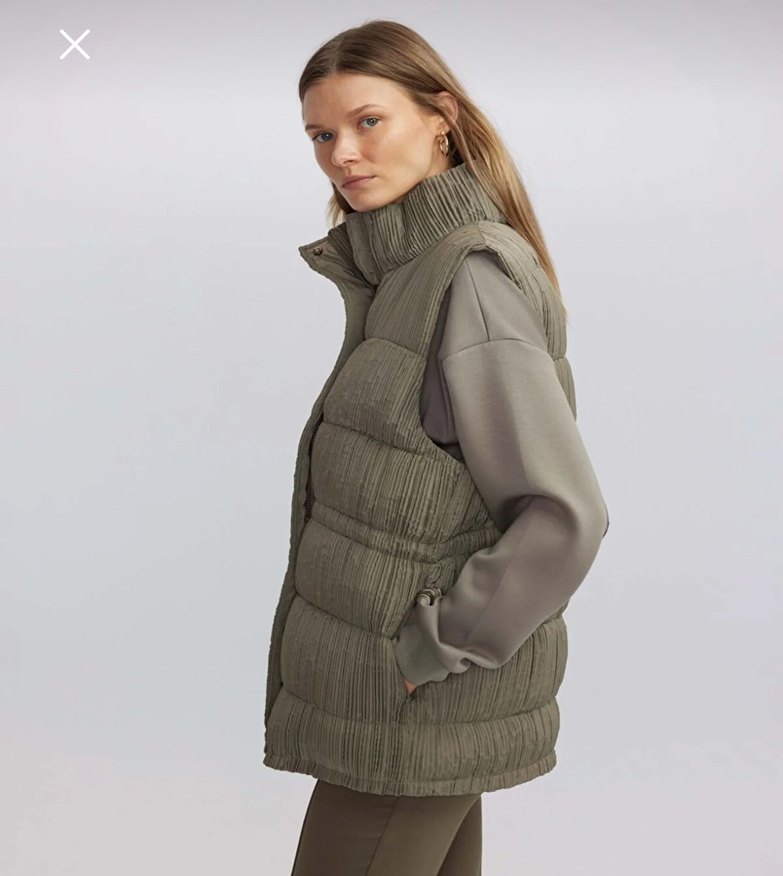 Yüksek yakalı, pilili tasarıma sahip gri renkli, yumuşak ve sıcak kumaştan üretilmiş kolsuz yelek. Rahat kesimi ve normal boyu ile gündelik sokak stiline uygun.