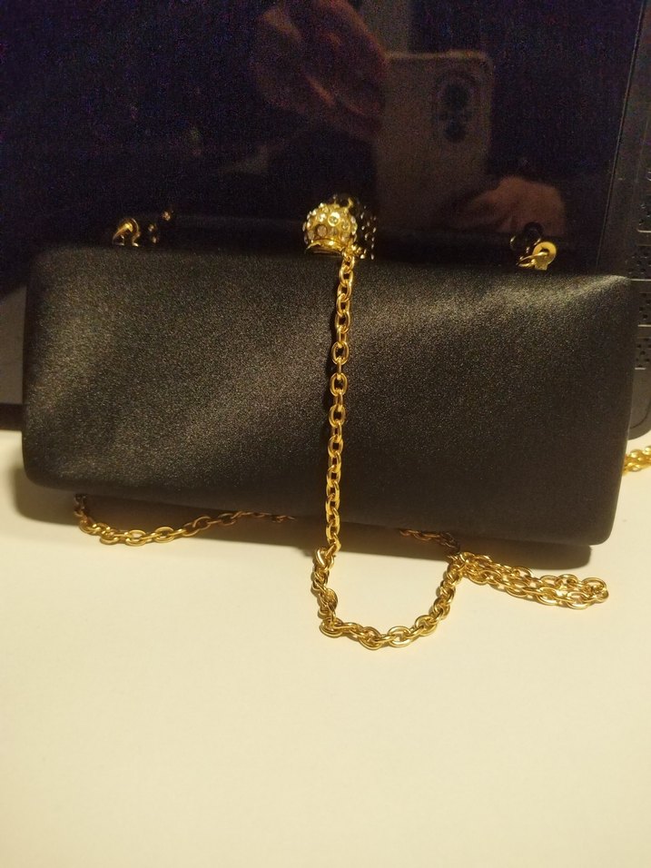 Saten siyah kumaş ve koyu altın zincir detaylı kadın portföy çanta, Klasik ve gotik tarzlara uygundur, düğünler ve davetler için ideal. Bir kere kullanıldı taş detayları bile düşmedi
