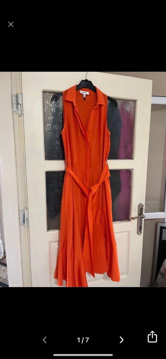 Kemerli, yakalı ve kolsuz uzun turuncu elbise, ipeksi kumaştan, regular fit kesimle modern Paris tarzını yansıtıyor.
