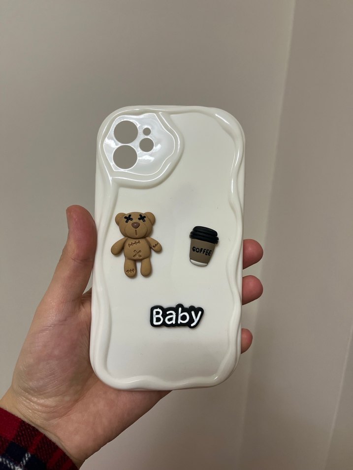 Pastel beyaz renkte, düğmeli ayıcık, kahve bardağı ve 'Baby' yazılı sokak stili telefon kılıfı.