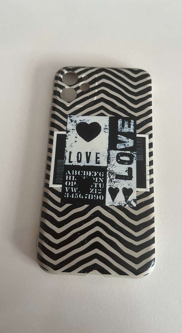 Siyah zemin üzerine baskılı counterculture desenli telefon kılıfı. Üzerinde 'LOVE' ve alfabe karakterleri yer alır.