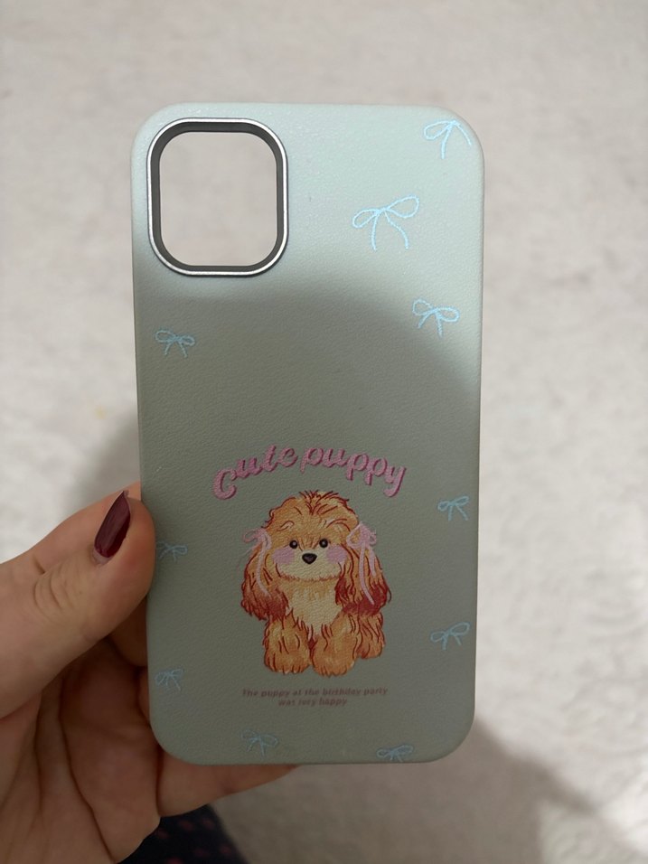 Parlak kahverengi bohem tarzda telefon kılıfı, sevimli köpek resmi ve ince fiyonk detaylarına sahip.