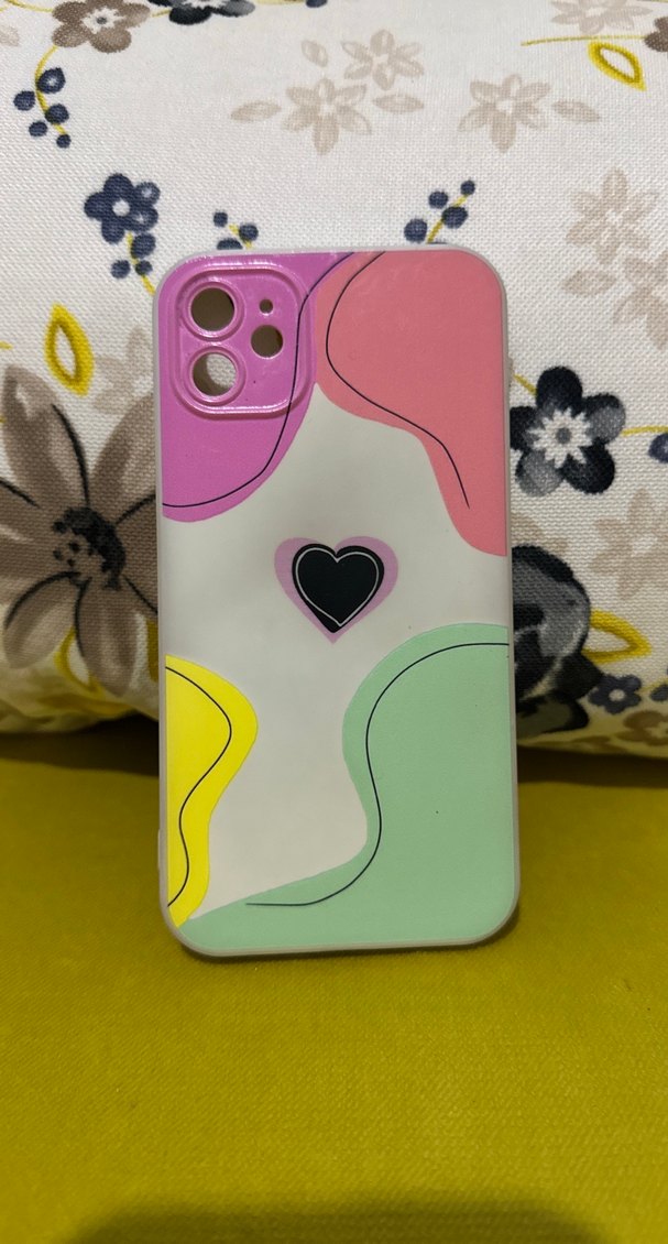 Parlak yüzeye sahip, pastel ve çok renkli soyut şekiller ile ortasında siyah kalp deseni bulunan pop kültür tarzı telefon kılıfı. ( AZ KULLANILDI )